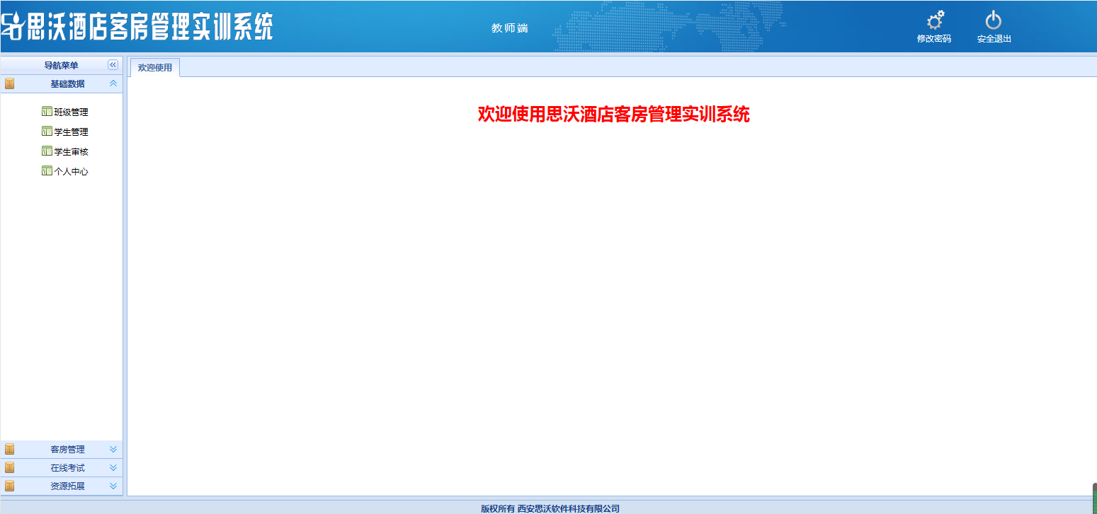 教師(shi)登(deng)陸界面(mian):基礎數據、客(ke)房管理,在線考試(shi),資源拓展每個大(da)模塊(kuai)(kuai)下分別有相應(ying)的子模塊(kuai)(kuai)。