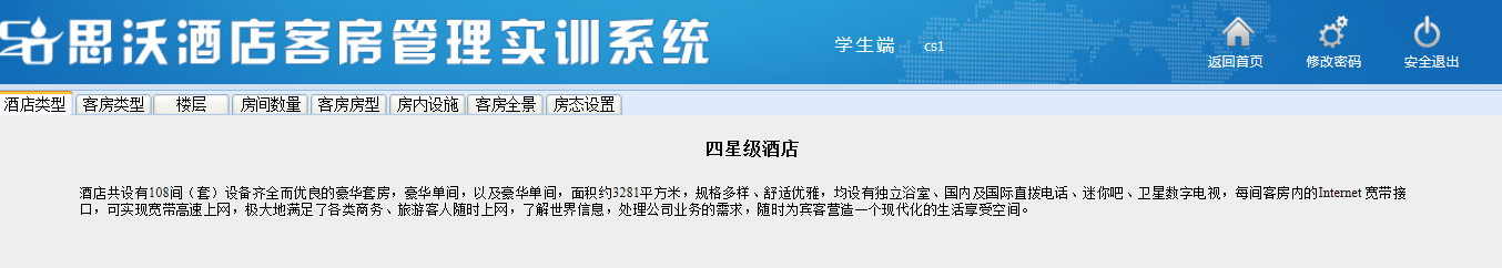 關鍵詞:思沃(wo)高(gao)校酒店客(ke)(ke)房(fang)管理(li)(li)教(jiao)學(xue)(xue)實訓(xun)系統 酒店客(ke)(ke)房(fang)管理(li)(li)實訓(xun)教(jiao)學(xue)(xue)軟(ruan)件 酒店客(ke)(ke)房(fang)管理(li)(li)實訓(xun)教(jiao)學(xue)(xue)平臺