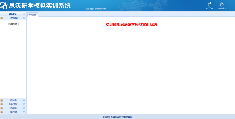 思沃研(yan)學(xue)(xue)模擬實訓(xun)系(xi)統分(fen)(fen)為管理員,教師,學(xue)(xue)生三種角色(se),功能包括推(tui)廣(guang)平臺、首頁,知(zhi)識庫,研(yan)學(xue)(xue)推(tui)廣(guang),圖文結合廣(guang)告(gao),媒(mei)體推(tui)送廣(guang)告(gao),研(yan)學(xue)(xue)調(diao)研(yan),研(yan)學(xue)(xue)設(she)計等(deng)(deng)。學(xue)(xue)生通(tong)過模擬實訓(xun)體驗(yan)從研(yan)學(xue)(xue)內(nei)容調(diao)研(yan)、研(yan)學(xue)(xue)路線設(she)計、研(yan)學(xue)(xue)核心(xin)價(jia)值發掘、研(yan)學(xue)(xue)媒(mei)體網(wang)絡推(tui)廣(guang)等(deng)(deng)一系(xi)列工作(zuo)內(nei)容。 研(yan)學(xue)(xue)軟件包含案(an)(an)例分(fen)(fen)析(xi),點評,研(yan)學(xue)(xue)線路設(she)計,團隊類(lei)型(xing)(xing),機型(xing)(xing),小交通(tong)標準(zhun),出入境口岸,匯率維(wei)(wei)護,酒(jiu)(jiu)店(dian)(dian)類(lei)型(xing)(xing),研(yan)學(xue)(xue)類(lei)型(xing)(xing)知(zhi)識庫類(lei)型(xing)(xing),案(an)(an)例類(lei)型(xing)(xing),航空公司,線路區域,團隊等(deng)(deng)級(ji),住宿標準(zhun),大交通(tong)標準(zhun),門票標準(zhun),餐(can)飲標準(zhun),導游證類(lei)別,酒(jiu)(jiu)店(dian)(dian)等(deng)(deng)級(ji),客戶(hu)(hu)行業分(fen)(fen)類(lei),客戶(hu)(hu)等(deng)(deng)級(ji)分(fen)(fen)類(lei),客戶(hu)(hu)關系(xi)深度,地接車等(deng)(deng)級(ji),客戶(hu)(hu)接受程度,國家維(wei)(wei)護,省(sheng)份(fen)維(wei)(wei)護,城市維(wei)(wei)護,景點類(lei)型(xing)(xing),學(xue)(xue)生可以進(jin)行系(xi)統的(de)模擬學(xue)(xue)習(xi)。